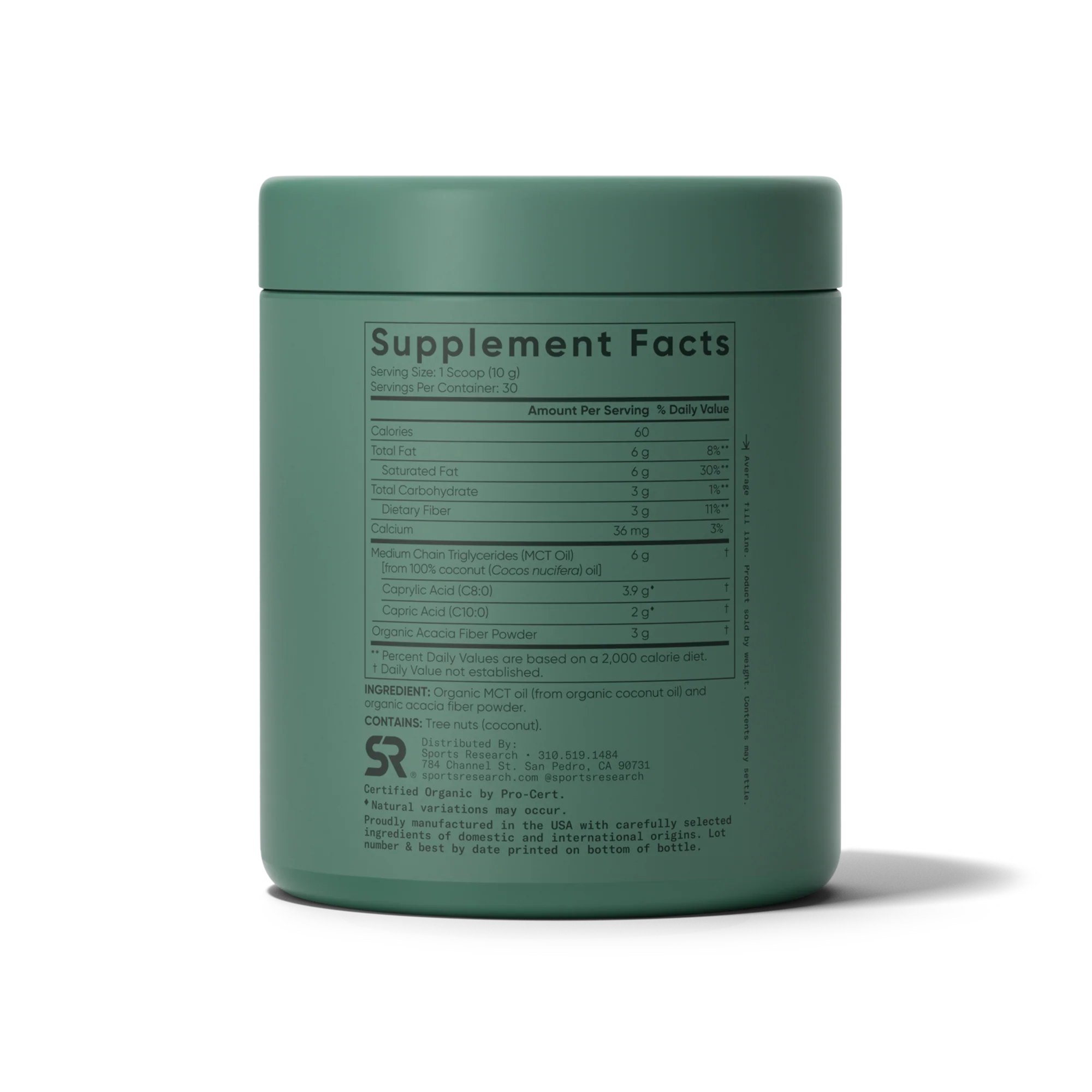 A creamy alternative to traditional MCT Oil Sports Research® Organic MCT Oil Powder contains a mix of Caprylic Acid (C8) & Capric Acid (C10) combined with acacia to deliver an optimal blend beneficial for low-carb or keto lifestyles & sourced only from Organic Coconuts.
